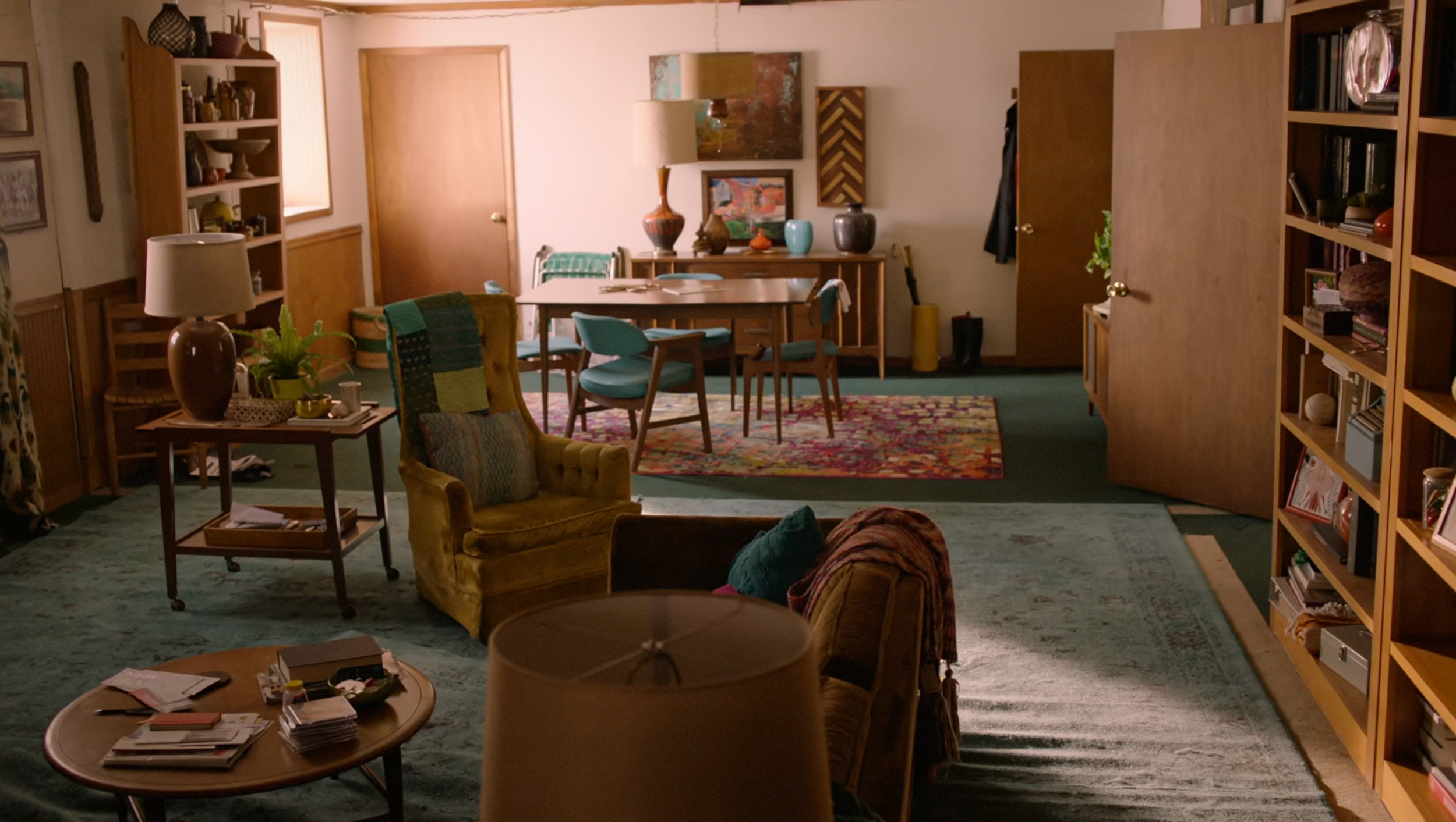 Mid-century modern in Brockmire doesn’t function as a scorecard for emotional health. Instead, it’s used as a point of contrast. Early on, Brockmire occupies or passes through well-composed, mid-century-leaning spaces that belong to other people — homes defined by balance and intention that only emphasize how unmoored he is. As the series progresses, the interiors become less about borrowing someone else’s order and more about Brockmire shaping spaces that reflect who he actually is. The design evolves from idealized calm to livable honesty.