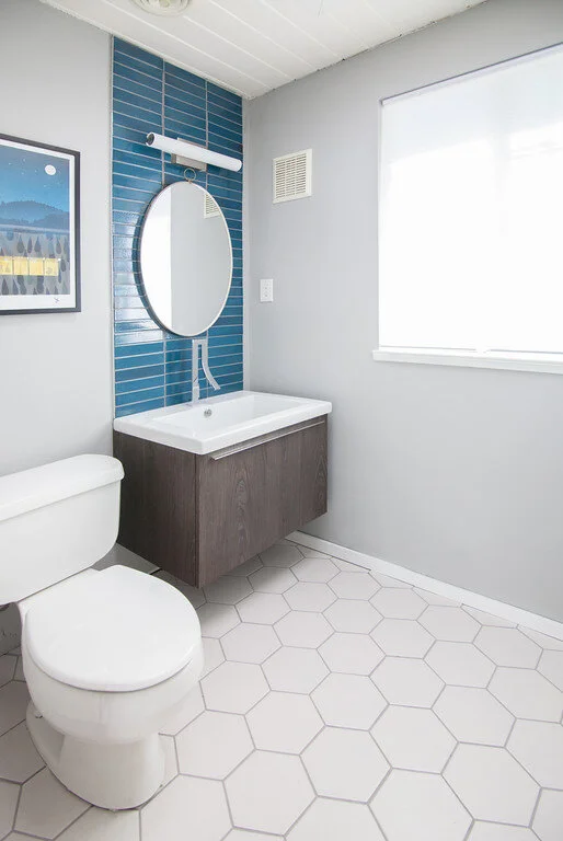 The overall design of this bathroom is more “modern” than full mid-century modern, but we tried our best to incorporate historic mid-century details and designs: the Heath tile, vintage Turner mirror, hexagon shaped tile, and Markimekko shower curtain all have roots from the 1950s and 1960s. The Tube Light is by George Kovacs, designed in 1954, also available at YLighting.