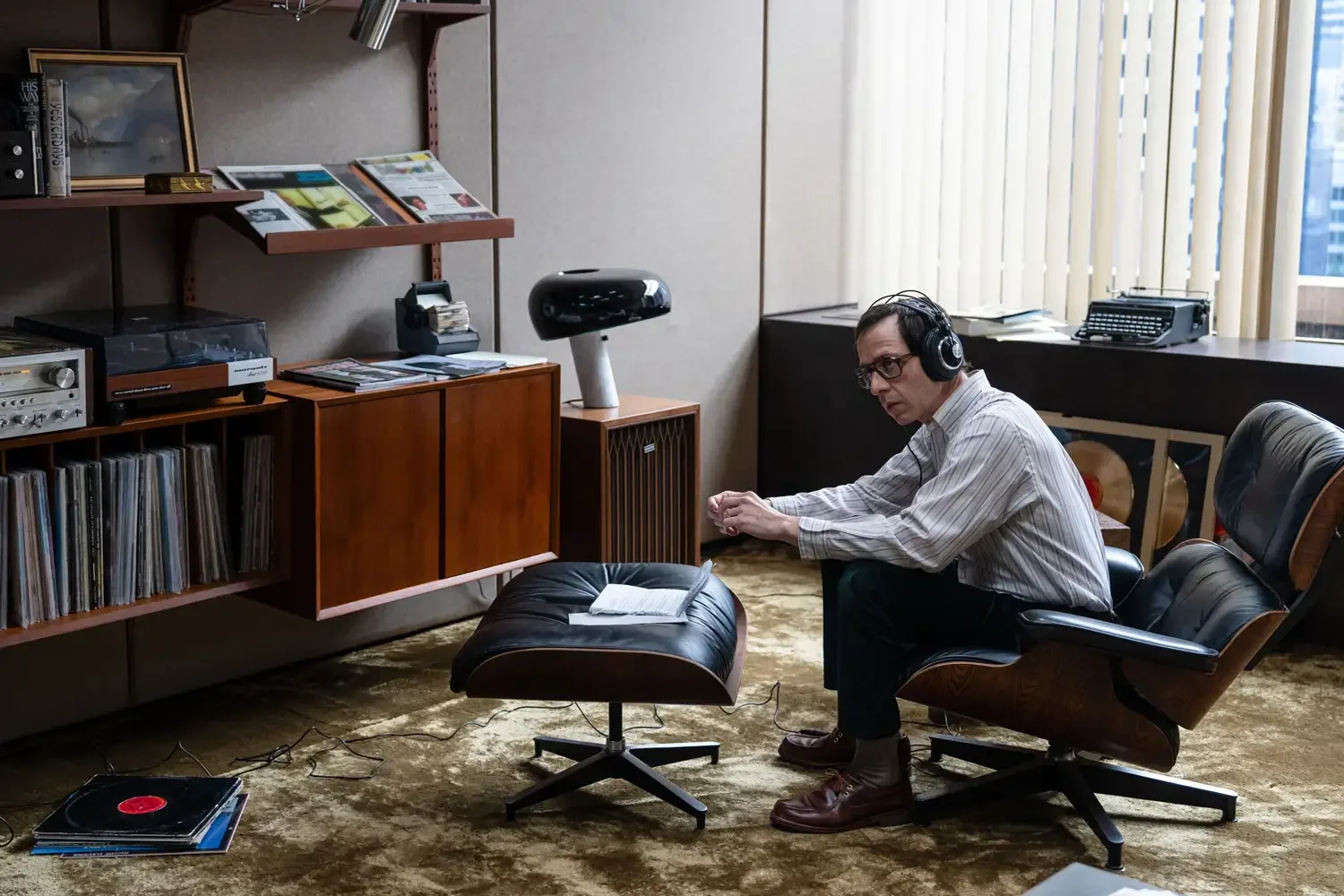 The pristine office was magnificent, featuring a Cado-style wood wall unit lined with records and vintage audio gear. You’ll spot a typewriter, Eames lounger, and over-the-ear-style headphones to top off the vibe, which served as a reflection of his much more organized personality. This was a fun contrast between the tight record business and the down-home artistic lifestyle of Bruce, yet the mid-century modern style was the throughline for the sets.