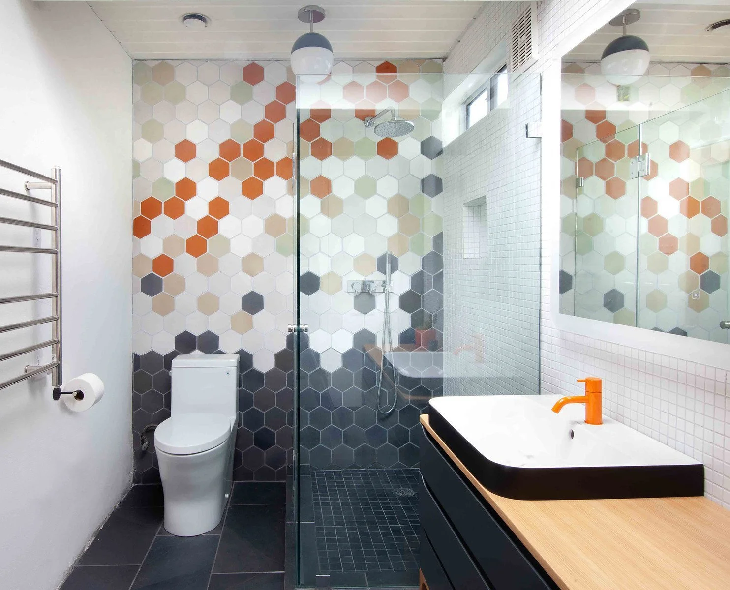 We went with the Vola HV1 faucet in orange to match some of the hex accent tiles on our feature wall.