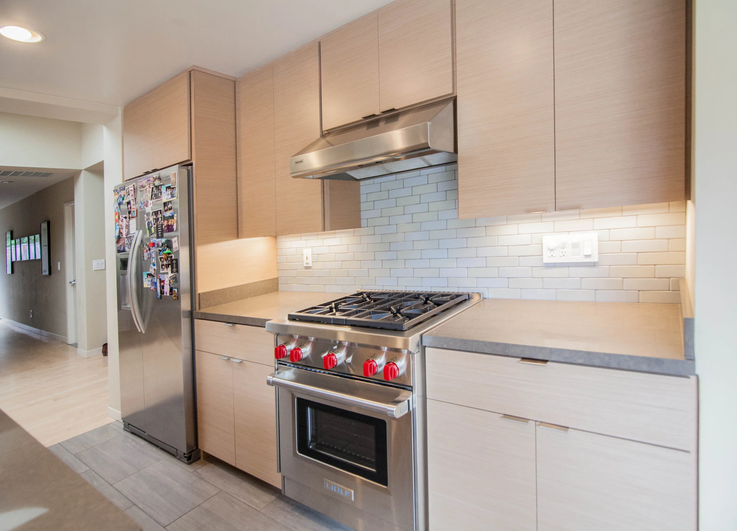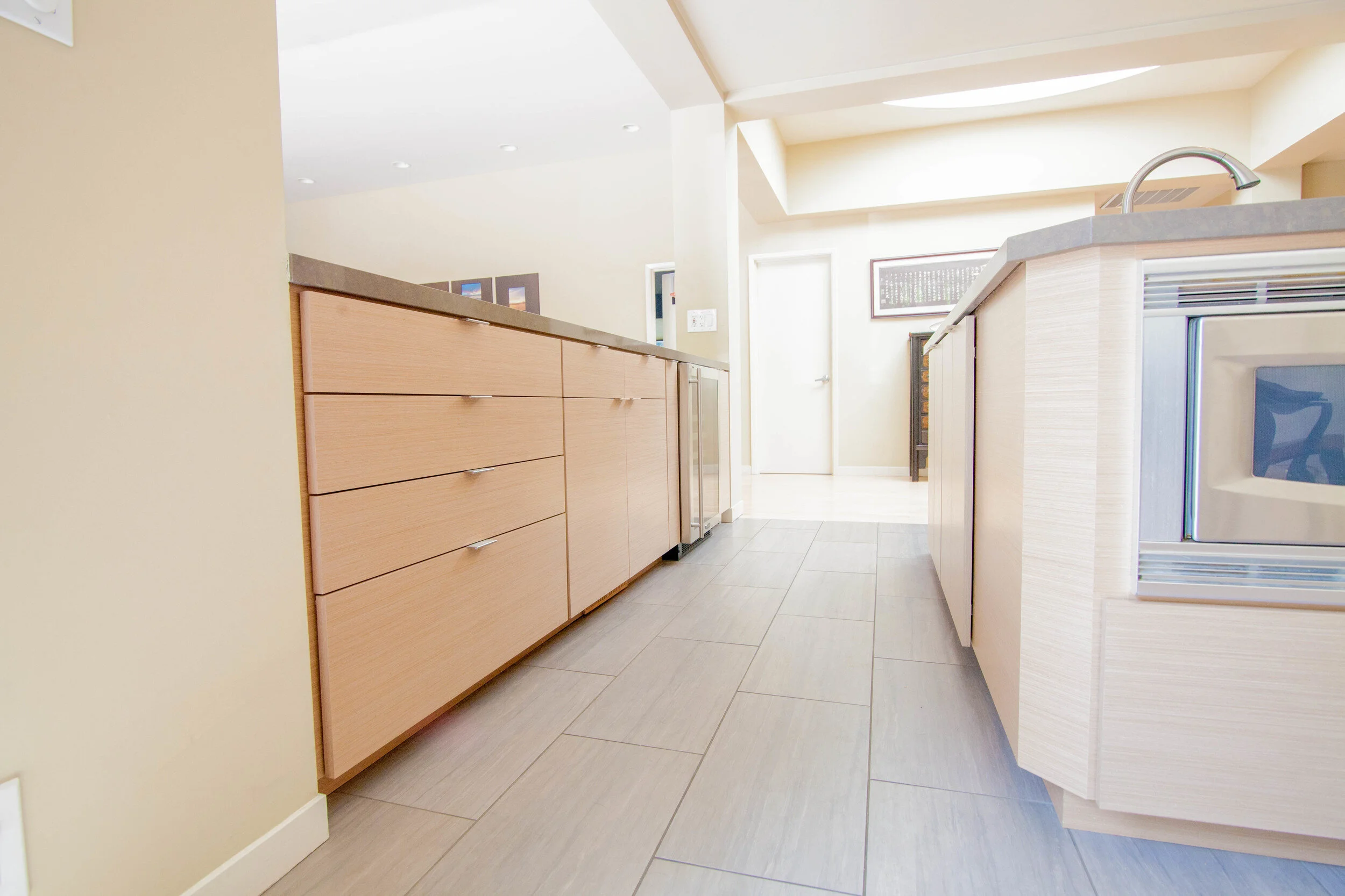 A unique custom built midcentury modern home on Stanford University's campus had a thoughtful renovation completed several years ago. However, the kitchen cabinetry became worn and dated. We helped to plan a light makeover for the space, with sleek new Silver Elm veneer doors and facing, bringing design parity to the home's modern updates and aesthetic.